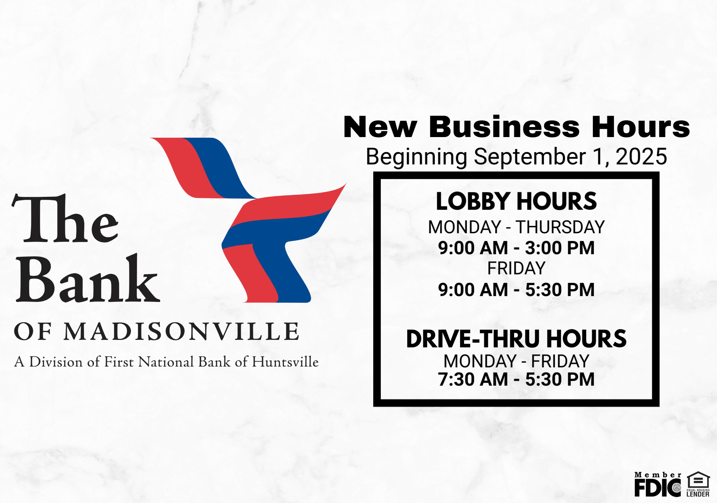 Beginning September 1, 2025, The Bank of Madisonville will be updating their business hours to better serve you! We remain committed to providing excellent service and appreciate your continued trust. #CommunityBanking #BusinessHoursUpdate