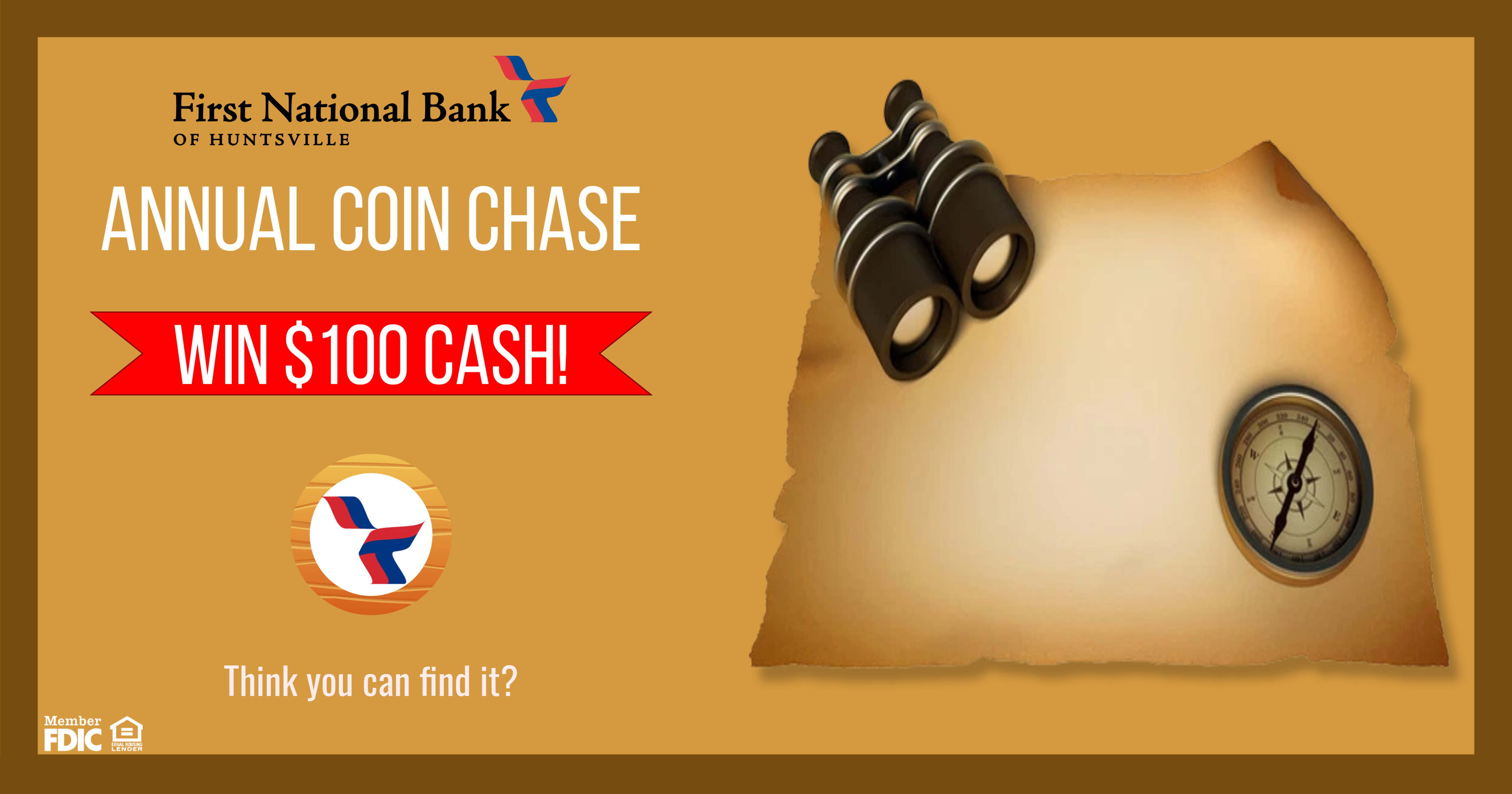 The Contest begins at 9 a.m. CDT on July 21, 2025 and ends once all wooden coins have been found (“Contest Period”). The WINNER(S) who successfully finds one of the hidden coins, will win the designated prizes. Winners will be announced at the close of the contest period, determined by the Sponsor, First National Bank of Huntsville.